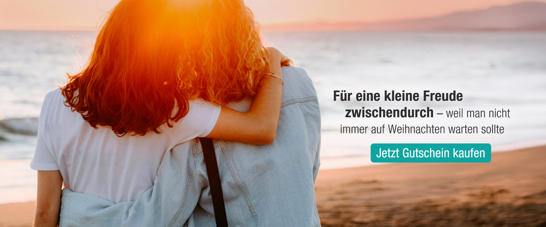 Zwei Personen umarmen sich am Strand bei Sonnenuntergang. Text: "Für eine kleine Freude zwischendurch... Jetzt Gutschein kaufen."