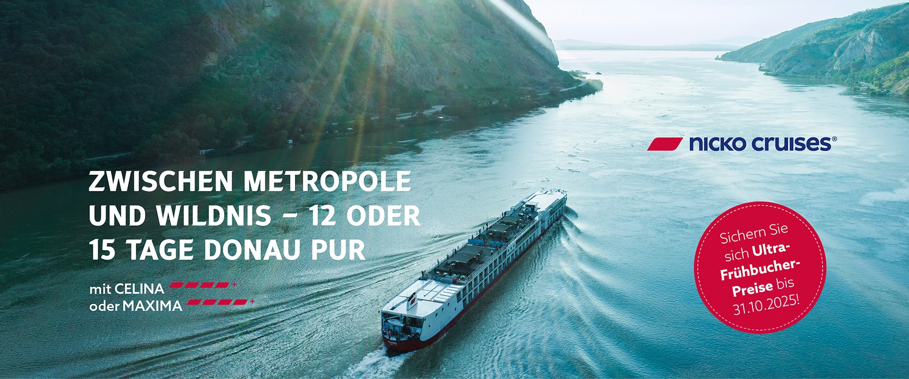 Blick über die Reling eines Kreuzfahrtschiffs auf das offene Meer. Die Kielspur des Schiffs zieht sich in die weite, blaue Ferne.